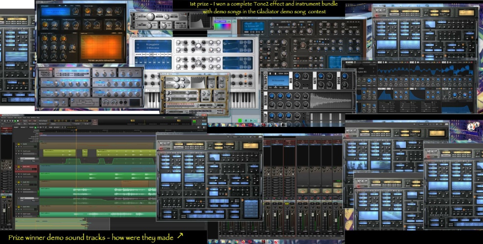 Lower part of this image: screen of a Gladiator demo song recording / mixing Upper part of this image: The Tone2 instrument and effect bundle I won with the 1st prize. These instruments and effects are the main parts of my arsenal now. (Updated: Oct. 2022)