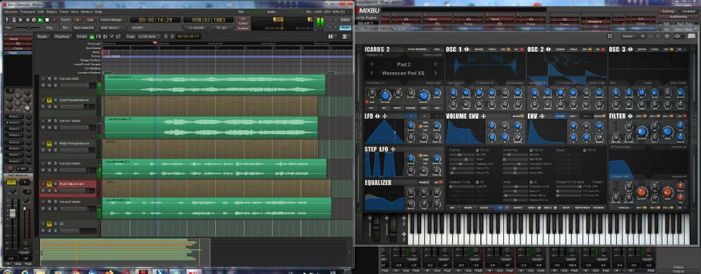 Screen shots of making and mixing one of tracks can be seen below. DAW / audio mixing: Harrison Mixbus. For MIDI processing I used Zynewave Podium as well.
