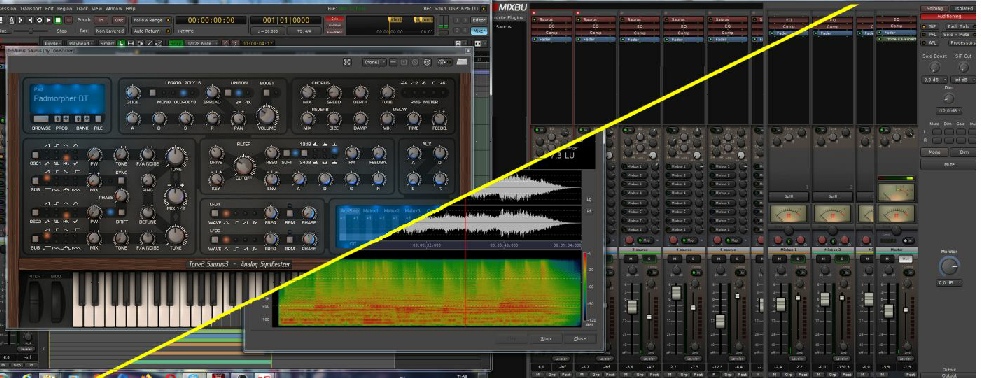 Saurus3 is an extremely authentic emulation of analog synthesizers. It was great to make sound demos for it. A combination of 2 screen shots of mixing can be seen below, and a typical screen of recording (2 nd image) DAW / audio mixing: Harrison Mixbus. For MIDI processing I used Zynewave Podium as well.